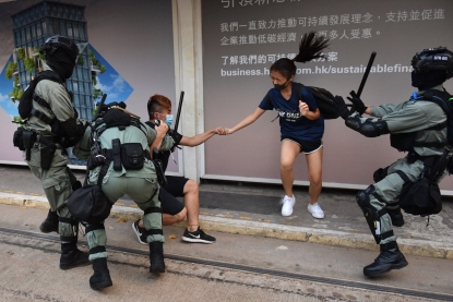 5 octobre 2019 à Hong Kong. (AFP / Nicolas Asfouri)Et il y a bien sur, la photographie de ce groupe de manifestants encerclés par la police après avoir quitté l’Université Polytechnique de Hong Kong, où il se sont retranchés pendant plusieurs jours. En sortant, ils sont tombés dans les filets des policiers. Sur leurs visages, on lit la fatigue. Ils sont épuisés. Ils ont les mains en l'air. Auparavant un policier armé leur a crié à deux reprises "Stop stop or I will shoot" (Arrêtez, Arrêtez ou je tire).